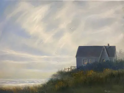 Tonight, we’re pleased to share Cottage Hill, an oil on canvas, which was purchased by the City last year at the annual Port Moody Art Association Show and Sale. Cottage Hill captures the quiet, fleeting beauty of a mist-filled morning. As Lanni paints, her images evolve beyond the original scene, transformed by the magic of a single moment in time.