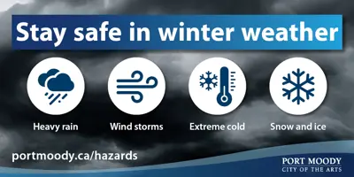 Winter can bring a wide variety of weather conditions such as heavy rain, wind storms, snow and ice, and freezing temperatures. Visit portmoody.ca/hazards for information on how to stay safe this winter.