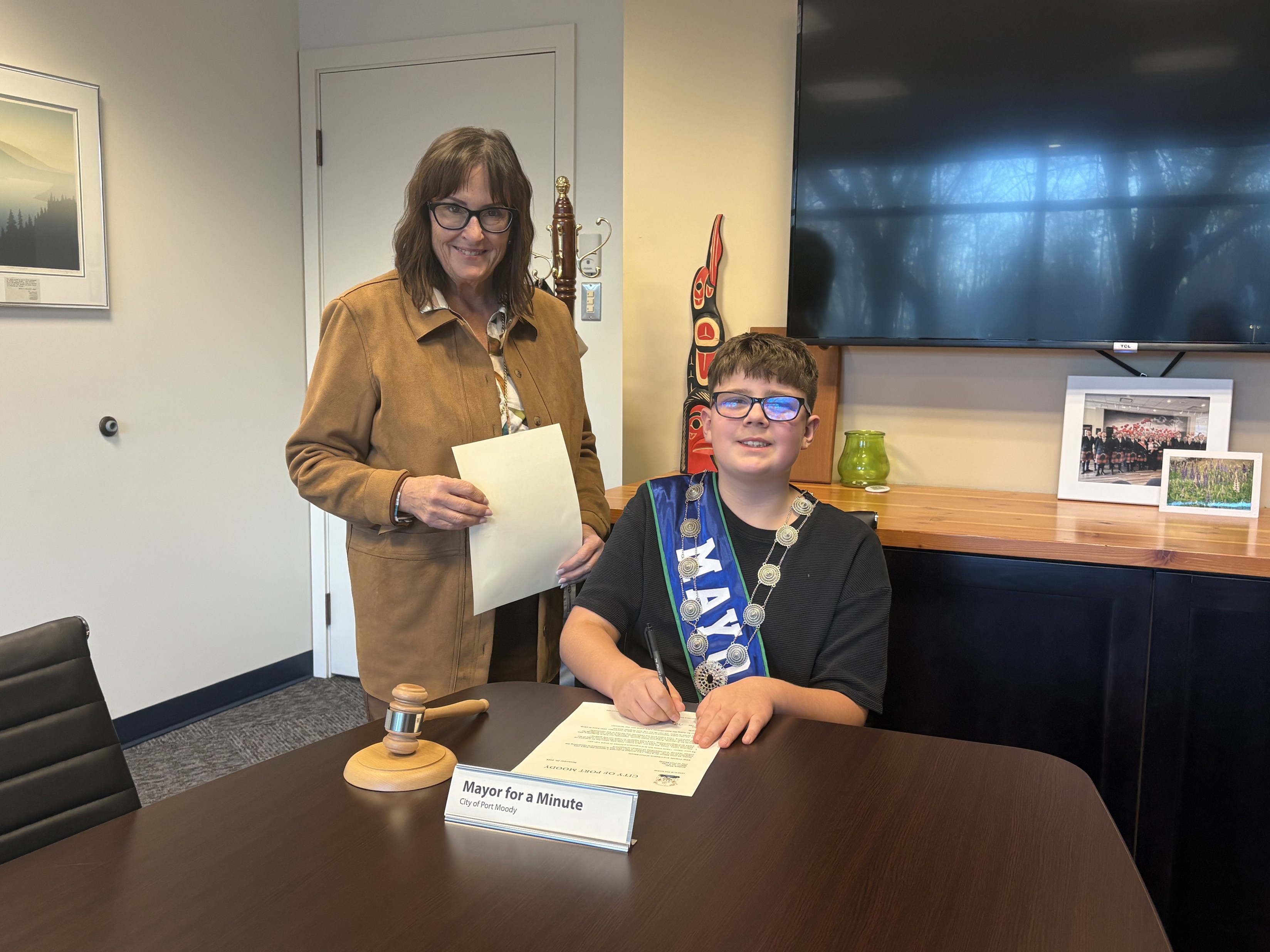 Mayor Meghan Lahti is pleased to announce that 11-year-old Anders, a resident of Port Moody, had the chance to be Mayor for a Day on November 20, 2025 – World Children’s Day. After finishing his school day, Anders toured City Hall and the Inlet Centre Fire Hall, learned about the role of mayor and council, and met with a member of the Port Moody Police Department. He also signed a document declaring November 20 to be Children’s Day in Port Moody and enjoyed some pizza with Mayor Lahti.