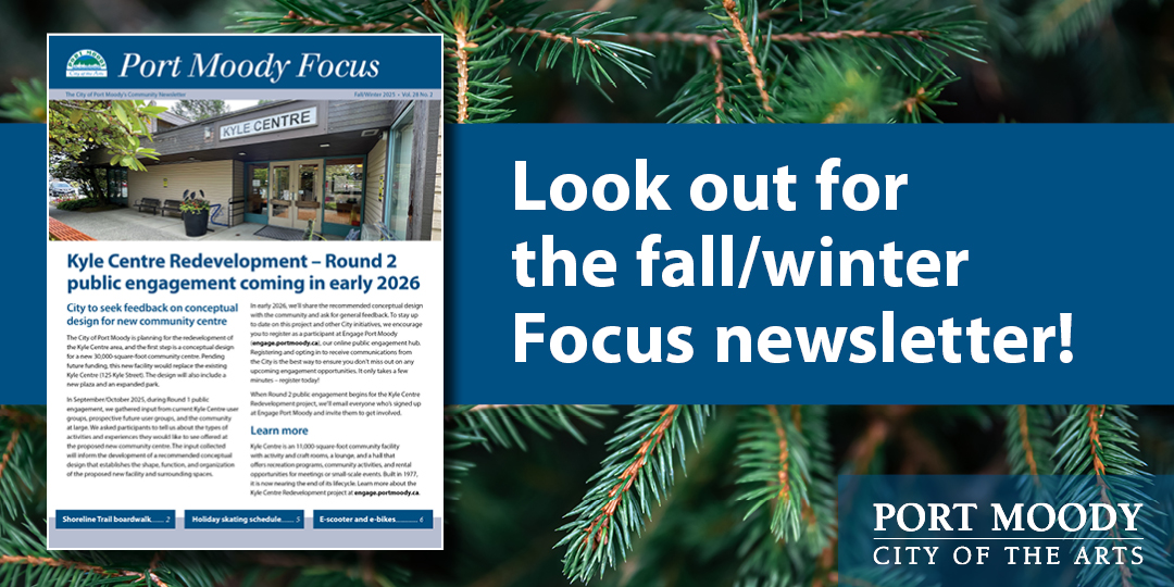 In our latest edition of Port Moody’s community newsletter, the Focus, you can read all about public engagement on the redevelopment of the Kyle Centre area, as well as a new, greener travel option: shared e-scooters and e-bikes for rent in locations throughout the city. You’ll also find tips on how to stay safe in winter weather and information on wildlife-friendly holiday decorating in Pioneer Memorial Park, plus community event listings and our public skating schedule for the holiday season. The Focus newsletter will be delivered to households and businesses November 19 through 21, 2025. A limited number of copies are available at City Hall and the Port Moody Public Library (both at 100 Newport Drive) as well as the Recreation Complex (300 Ioco Road). You can also read the fall/winter edition online at portmoody.ca.